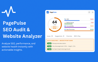 PagePulse is een krachtige browserextensie voor Chrome die gebruikers in staat stelt om websites grondig te analyseren op SEO, prestaties, toegankelijkheid en beste praktijken. Met een gebruiksvriendelijke interface biedt deze tool een score van 0 tot 100 en geeft het concrete aanbevelingen voor verbeteringen. Gebruikers kunnen ook de geschiedenis van hun analyses bijhouden, wat handig is voor het monitoren van voortgang over tijd.